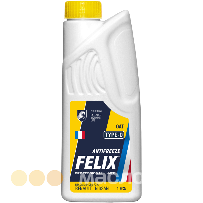 Антифриз FELIX® Type-D представляет собой смесевую композицию на основе водного раствора этиленгликоля, воды и карбоксилатного пакета стабилизирующих и антикоррозионных присадок, содержащих противопенные и красящие добавки. Рекомендован к заливке в автомобили RENAULT, NISSAN.
