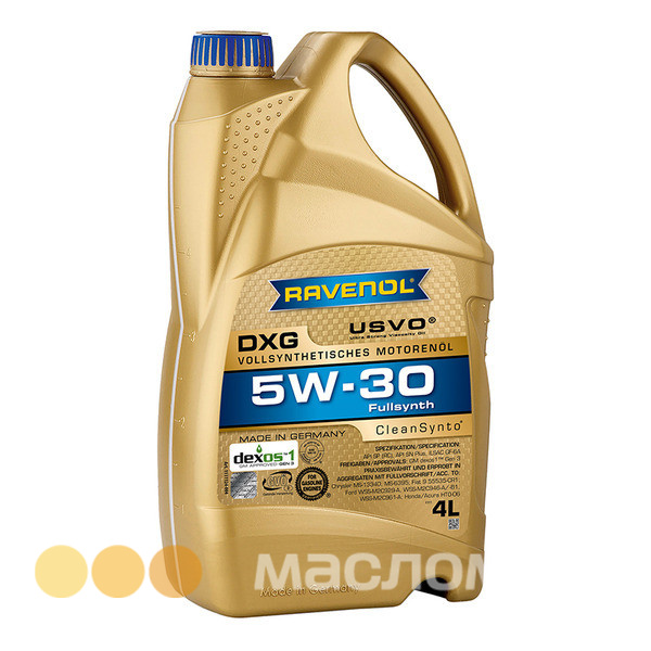 RAVENOL DXG SAE5W-30 – полностью синтетическое моторное масло на основе полиальфаолефинов (ПАО), изготовленное с применением технологий USVO® и CleanSynto® для легковых бензиновых моторов с и без турбонаддува и прямым впрыском топлива.