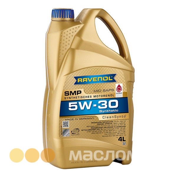 RAVENOL SMP SAE 5W-30 - синтетическое легкотекучее среднезольное (MID SAPS) моторное масло, изготовленное с применением технологии CleanSynto® для легковых бензиновых и дизельных моторов
