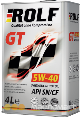 Премиальное полностью синтетическое моторное масло с комбинацией высококачественных базовых компонентов с новейшими присадочными технологиями обеспечивает быстрый и легкий запуск двигателя при самых низких температурах, превосходную защиту двигателя от износа и увеличенный интервал замены. Предотвращает образование отложений в масляной системе, обеспечивает чистоту двигателя. Синтетическое масло ROLF GT 5W-40 имеет высшую спецификацию моторных масел для бензиновых двигателей легковых автомобилей - API SN.